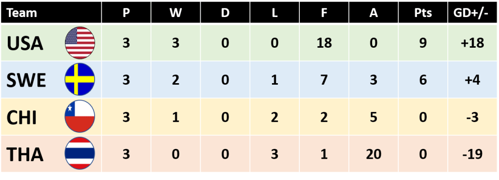 The United States qualified for the knockout phase as group F winners beating Sweden by two goals to nil in the Stade Océane. Goals at the beginning of each half gave the Scandinavians too much to do, even though they were able to create a few defensive problems for Jill Ellis’s side.