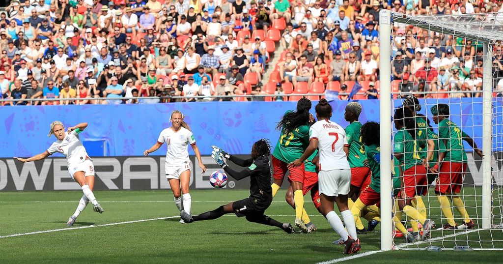 England progressed to a quarter final showdown with Norway after weathering a physical storm from Cameroon. The goals were only half the story in a bruising and highly charged encounter in Valenciennes. By no means an accomplished display by the Lionesses technically, this was a victory for discipline. England kept theirs; Cameroon’s disintegrated with every VAR decision. Steph Houghton opened the scoring from an indirect free-kick after keeper Annette Ngo Ndom had misguidedly picked up a back-pass. Ellen White then doubled the advantage with a trademark finish running in behind the defence. Left back, Alex Greenwood, completed the scoring in the second half, arriving on the penalty spot to meet Toni Duggan’s corner and half volleying it past the keeper.