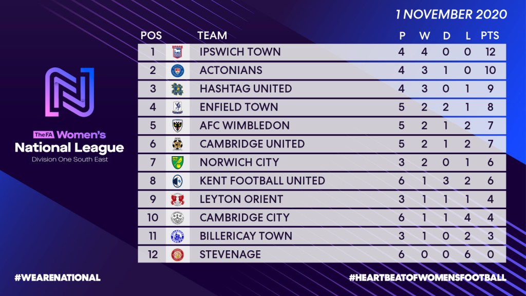 There are 12 teams in the division – effectively unchanged from last season although AFC Basildon merged with Hashtag United and took their name. So, along with the Dons the league contains: Actonians, Billericay Town, Cambridge City, Cambridge United, Enfield Town, Hashtag United, Ipswich Town, Kent Football United, Leyton Orient, Norwich City and Stevenage.
