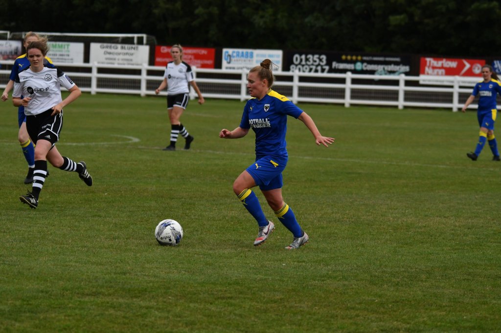 The Dons edged in front on 14 minutes. Rosie Russell’s throw-in from the right found Megan Stow, she rolled her marker and played wing-back Emily Oliver into the penalty area. Oliver didn’t hesitate and curled her shot around keeper Amy Mullett from 12-yards – her first senior goal with the Dons.