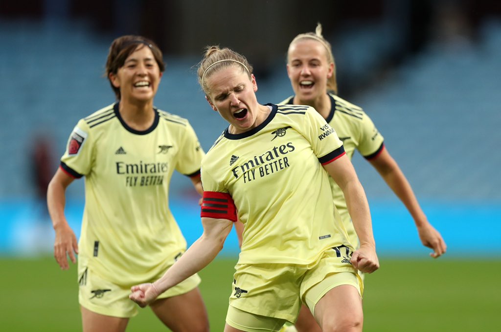 Midfielder Kim Little scored her 150th goal for Arsenal as the league leaders maintained their 100% record with a late flurry of goals at Villa Park.