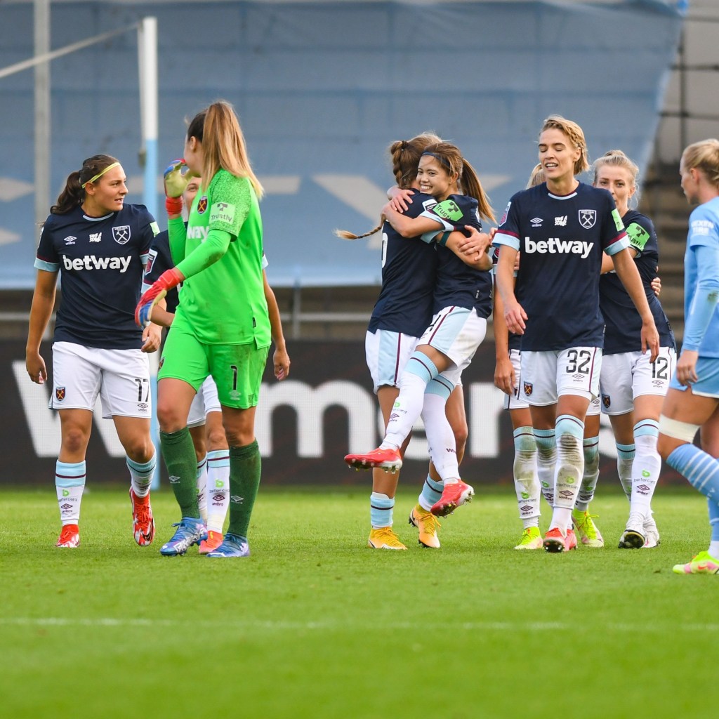 The Hammers took the lead in the 39th minute. Yui Hasegawa was played into space on the right, ran to the by-line and crossed to the far post where Dagný Brynjarsdóttir was arriving to power home. [Celebration at top of article…]